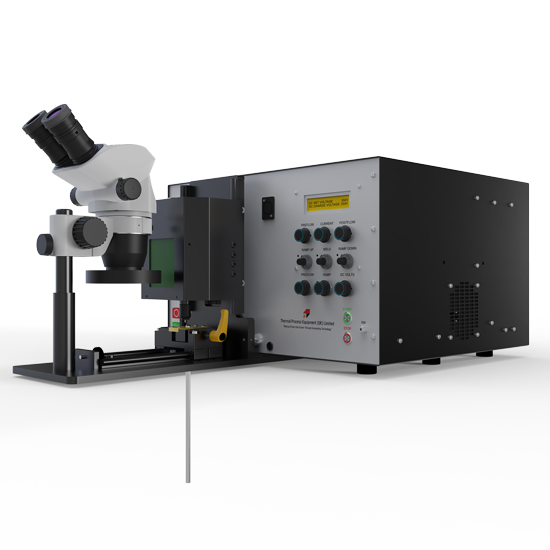 A compact, production-ready welding system combining TIG sheath welding and capacitance discharge (CD) conductor welding into a single precision workstation for thermocouple manufacture. The machine delivers micrometer-accurate weld positioning and consistent weld quality across a wide range of cable diameters. Wear-resistant Elkonite jaw sets are used to withstand the thermal and electrical demands of both TIG and CD welding, ensuring long service life in production environments. Either an Olympus or Nikon stereoscopic microscope with high-intensity LED ring illumination provides clear inspection of the weld zone, while a dedicated welding-glass viewing window allows real-time observation during operation. Designed for sustained duty, the system incorporates active forced-air cooling and electrically over-rated key components for reliability.