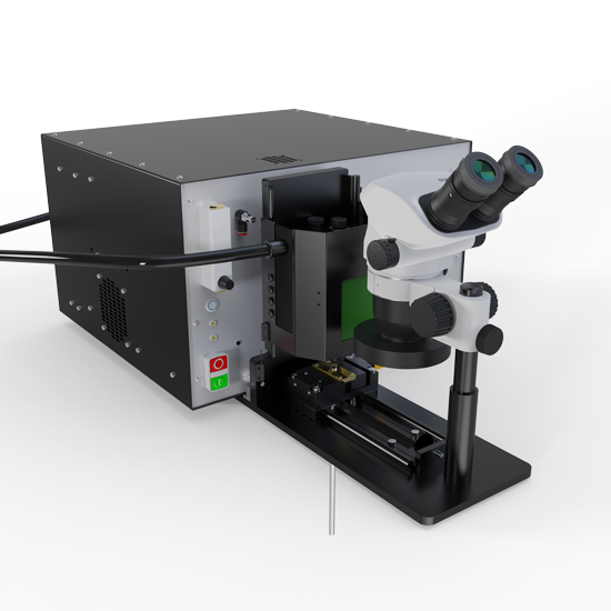 A compact, production-ready welding system combining TIG sheath welding and capacitance discharge (CD) conductor welding into a single precision workstation for thermocouple manufacture. The machine delivers micrometer-accurate weld positioning and consistent weld quality across a wide range of cable diameters. Wear-resistant Elkonite jaw sets are used to withstand the thermal and electrical demands of both TIG and CD welding, ensuring long service life in production environments. Either an Olympus or Nikon stereoscopic microscope with high-intensity LED ring illumination provides clear inspection of the weld zone, while a dedicated welding-glass viewing window allows real-time observation during operation. Designed for sustained duty, the system incorporates active forced-air cooling and electrically over-rated key components for reliability.